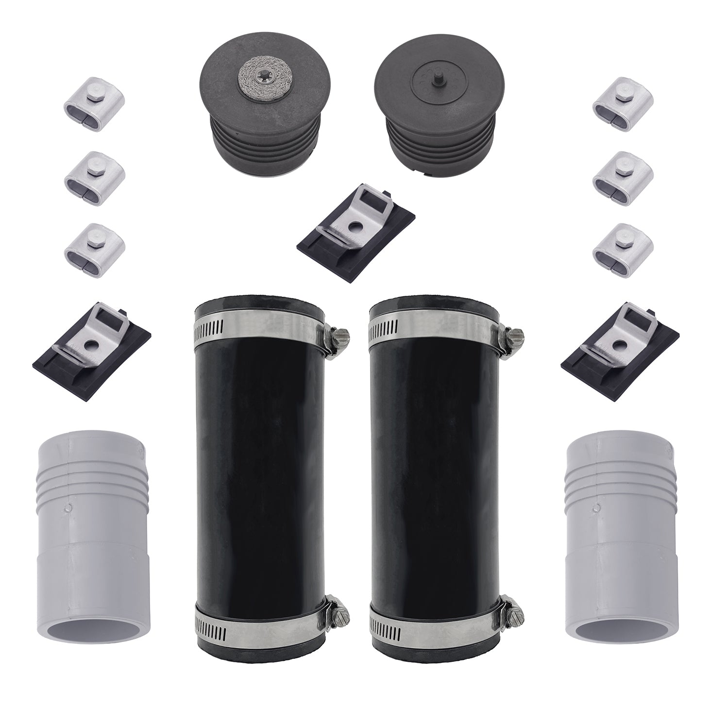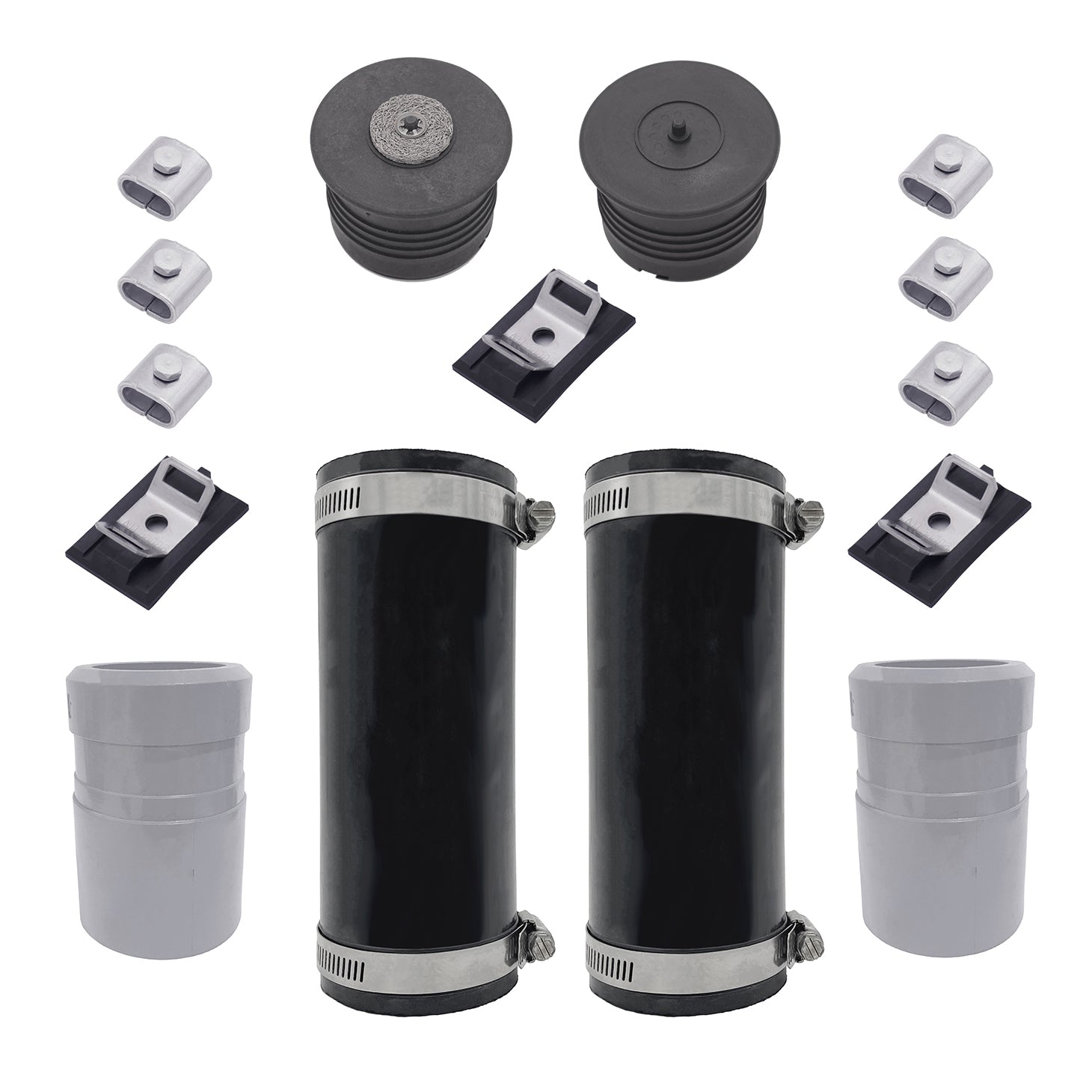 Panel connector hoses are molded EPDM rubber designed specifically for use with solar pool heating systems. Outlet header bracket, strap brackets, strap clamps and hose clamps are stainless steel construction for optimal strength and corrosion resistance. Kit also includes flashing bases to support lag bolt attachment to the mounting surface and provide enhanced seal.